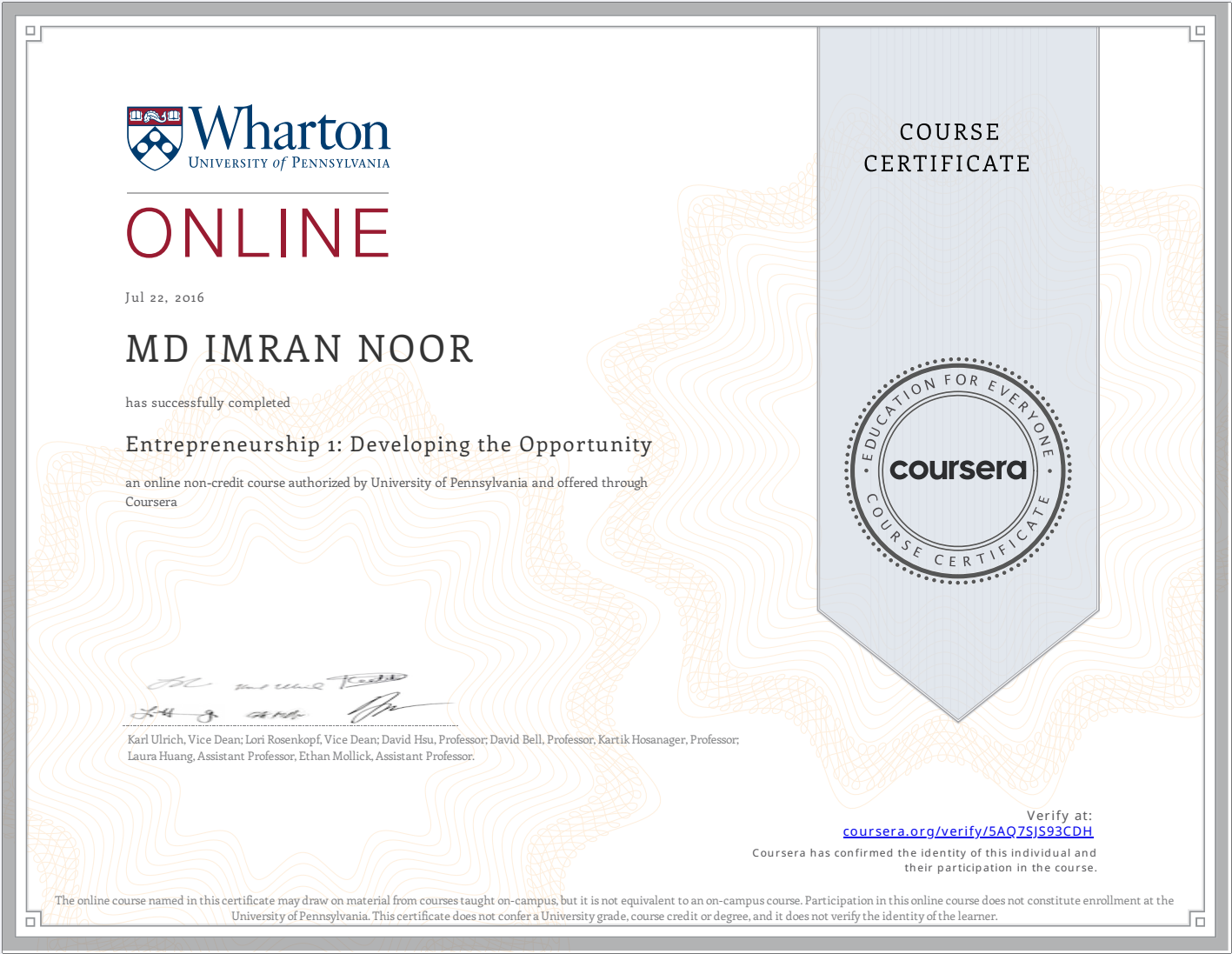 Entrepreneurship 1: Developing the Opportunity and Entrepreneurship 2: Launching your Start-Up courses offered by The Wharton School of the University of Pennsylvania on Coursera, taught by Lori Rosenkopf, Karl Ulrich, Ethan Mollick, David Bell, and David Hsu, achieving an average grade of 91.75%. These beginner-friendly courses, part of Wharton’s Entrepreneurship Specialization, introduce the fundamentals of identifying business opportunities and launching a start-up. They are designed for aspiring entrepreneurs and require no prior business experience, focusing on practical skills for building a viable venture. The courses cover key topics such as opportunity identification, market analysis, business model development, and start-up execution. Major content in Entrepreneurship 1 includes evaluating entrepreneurial opportunities, conducting customer and competitive analysis, and crafting value propositions. Entrepreneurship 2 focuses on building a business model, developing a go-to-market strategy, and addressing operational challenges like team-building and funding. The courses feature video lectures, case studies, peer-reviewed assignments, and a final project to develop a business pitch. I learned how to identify and validate business opportunities, analyze market dynamics, and create actionable strategies for launching a start-up. The courses sharpened my ability to think critically about customer needs and develop sustainable business models, while the final project honed my skills in pitching ideas effectively. While centered on entrepreneurship, these skills enhance image processing and high-quality image/video production by fostering strategic and analytical thinking. Market analysis techniques help me understand audience preferences, optimizing visual content for engagement. Developing value propositions translates to crafting compelling narratives in photography and video projects, while operational strategies streamline production workflows, ensuring efficient delivery of professional-grade visuals.