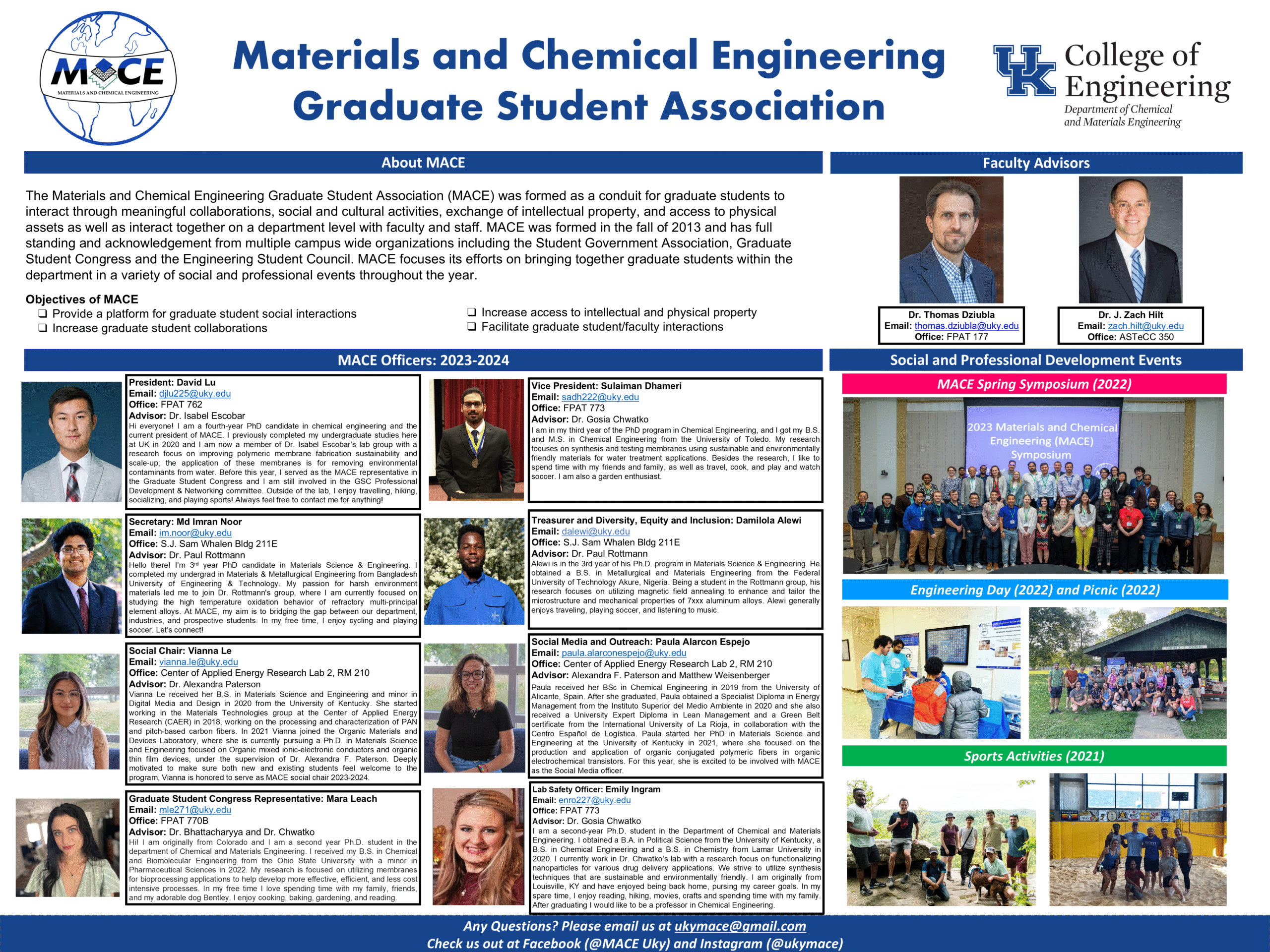 As the General Secretary of the Materials and Chemical Engineering (MACE) Graduate Student Association at the University of Kentucky for the 2023-2024 term, I spearheaded the strategic planning and execution of a diverse array of events designed to enrich the academic, professional, and social experiences of graduate students. Leading a dedicated team, I was responsible for ideating innovative initiatives and ensuring their seamless implementation, fostering a vibrant community for MACE graduate students.