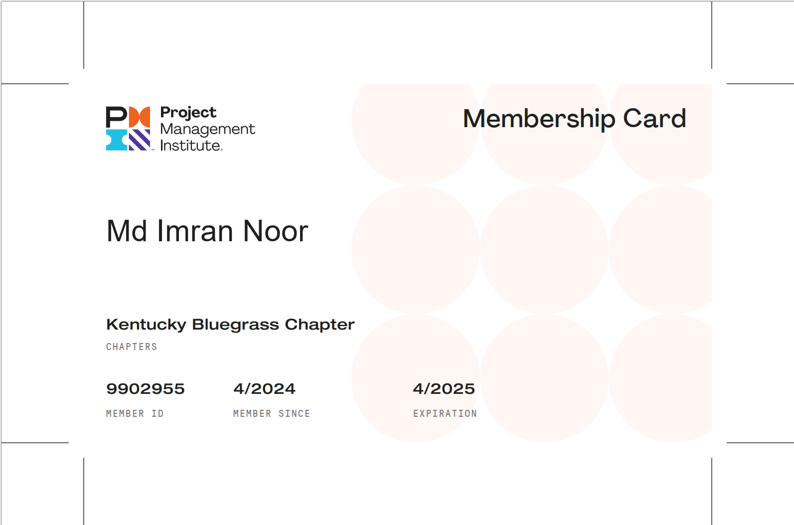 My membership in the Project Management Institute (PMI) and its Kentucky Chapter, starting in 2024, enhances my project management capabilities through resources like the PMBOK Guide, webinars, and networking events. This affiliation strengthens my ability to lead complex projects, including those in image and video production, by ensuring efficient workflows, risk mitigation, and stakeholder alignment, resulting in high-quality, timely deliverables.
