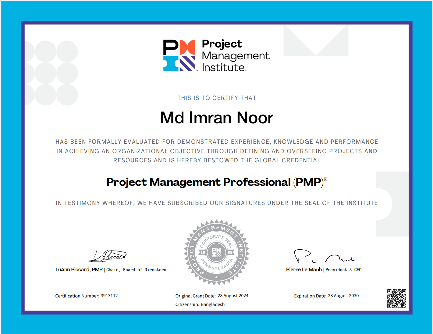 I’ve earned the Project Management Professional (PMP) certification from the Project Management Institute (PMI), achieving a score above the target in all domains. This globally recognized certification validates expertise in project management, equipping professionals to lead complex projects across industries. The PMP is designed for experienced project managers, requiring a combination of education, professional experience, and rigorous examination to demonstrate mastery of project management principles.
